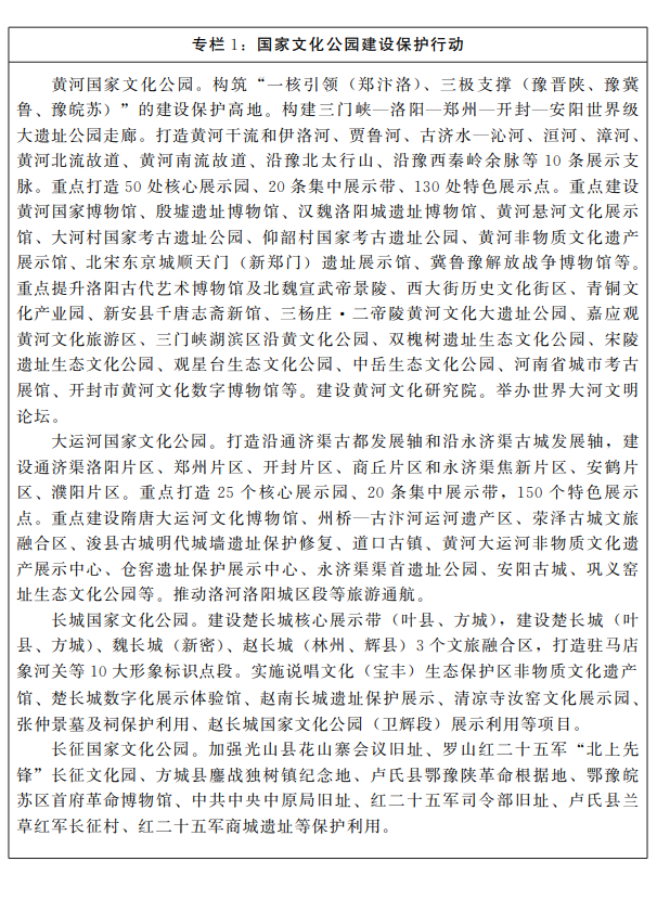 充分发挥黄河、大运河、长城、长征国家文化公园在河南的叠加优势,整合沿线具有突出意义、重要影响、重大主题的文物和文化资源,实施公园化管理运营,形成具有特定开放空间的公共文化载体,集中打造中华文化重要标志,探索新时代文物和文化资源保护传承利用新路,建设国家文化公园示范省。高标准打造黄河国家文化公园重点建设区,彰显华夏文明主根、国家历史主脉、中华民族之魂战略地位,建设中华文明连绵不断的探源地、实证地和体验地。推进隋唐大运河文化博物馆等一批大运河国家文化公园工程项目,展示“隋唐胜迹·运河根脉”品牌形象。重点打造楚长城文化和旅游复合廊道,展示“万里长城·河南开端”品牌形象。推出红二十五军长征步道体验线路,展示“北上先锋”品牌形象。